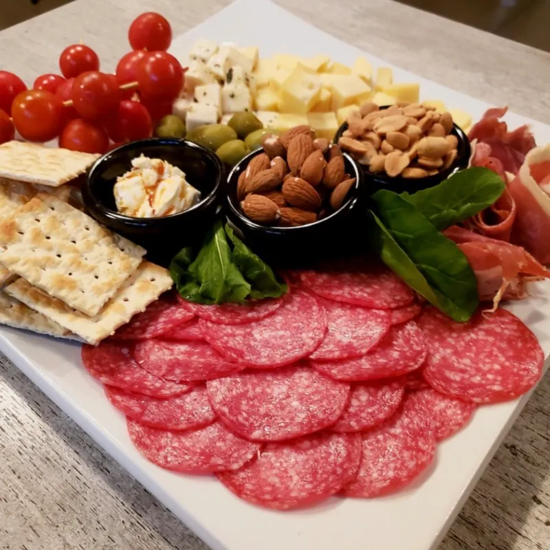 Selección de jamón serrano, queso parmesano, queso gouda,chorizos, aceitunas verdes y negras, tomate cherry, pan rústico tostado y aceite de oliva virgen extra. Para compartir o darse un capricho