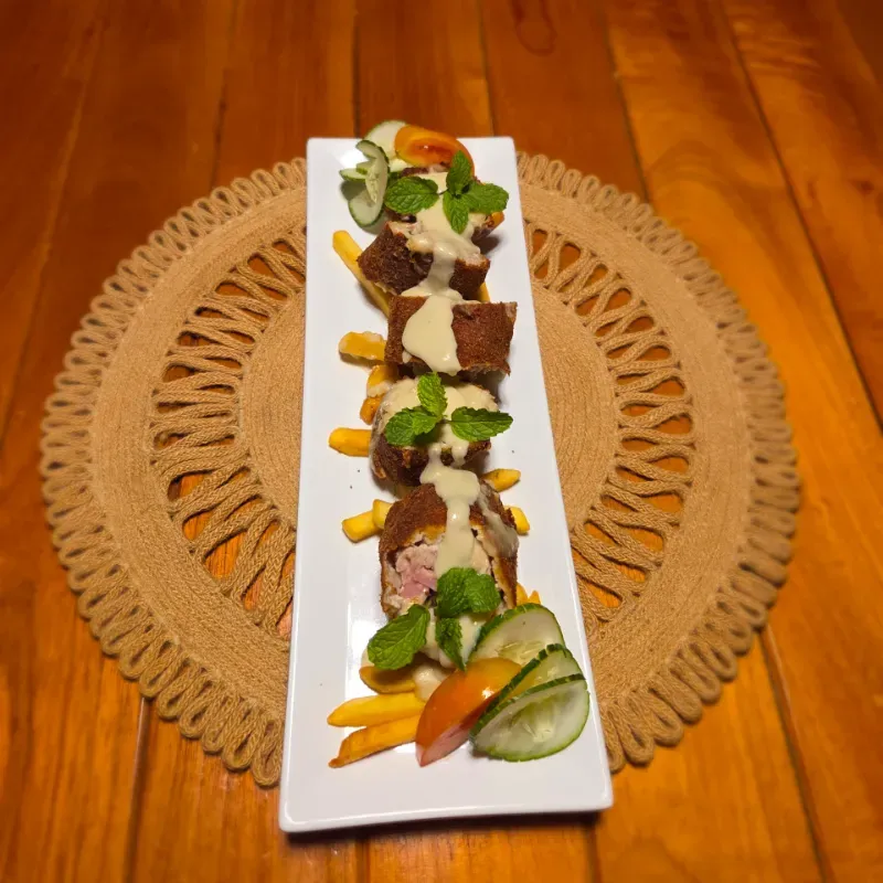 Lomo de cerdo sazonado con condimentos parrilleros, empanizado en harina y pan rallado crujiente, relleno de queso gouda fundido. Servido con puré de papa cremoso y acompañado de una irresistible salsa barbacoa artesanal. Una combinación clásica y reconfortante con un toque sofisticado.