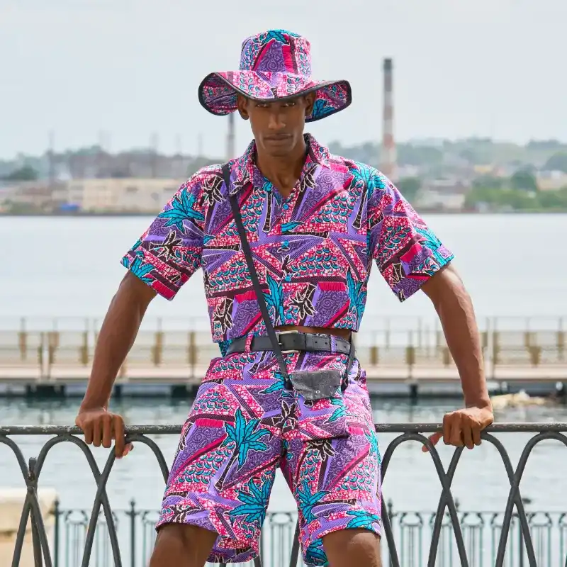 Conjunto confeccionado en tela de algodón angolano. Dos piezas. Short largo con trabillas y bolsillos laterales y camisa asimétrica.