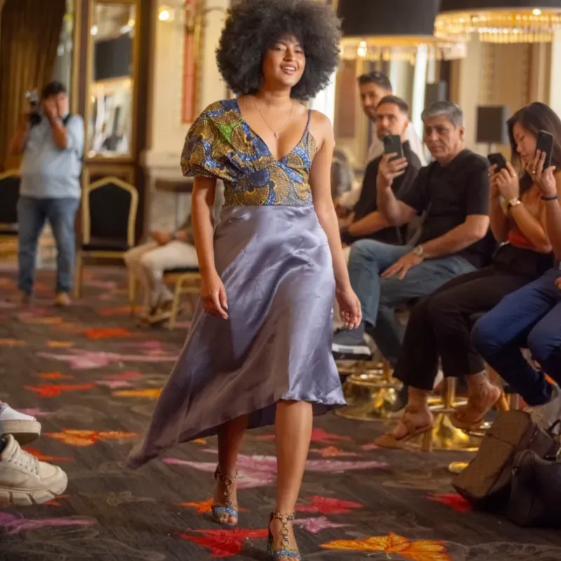 Vestido de una manga combinado en color gris y estampado