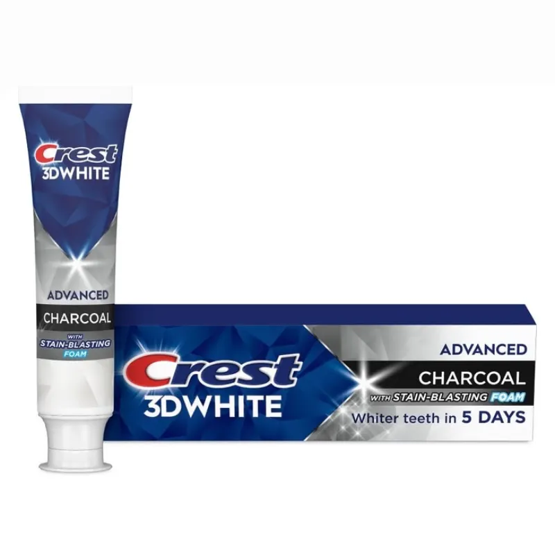 La pasta de dientes 3D White Brilliance Charcoal de Crest blanquea los dientes con una fórmula de carbón que elimina las manchas superficiales. Contiene flúor para combatir las caries.
