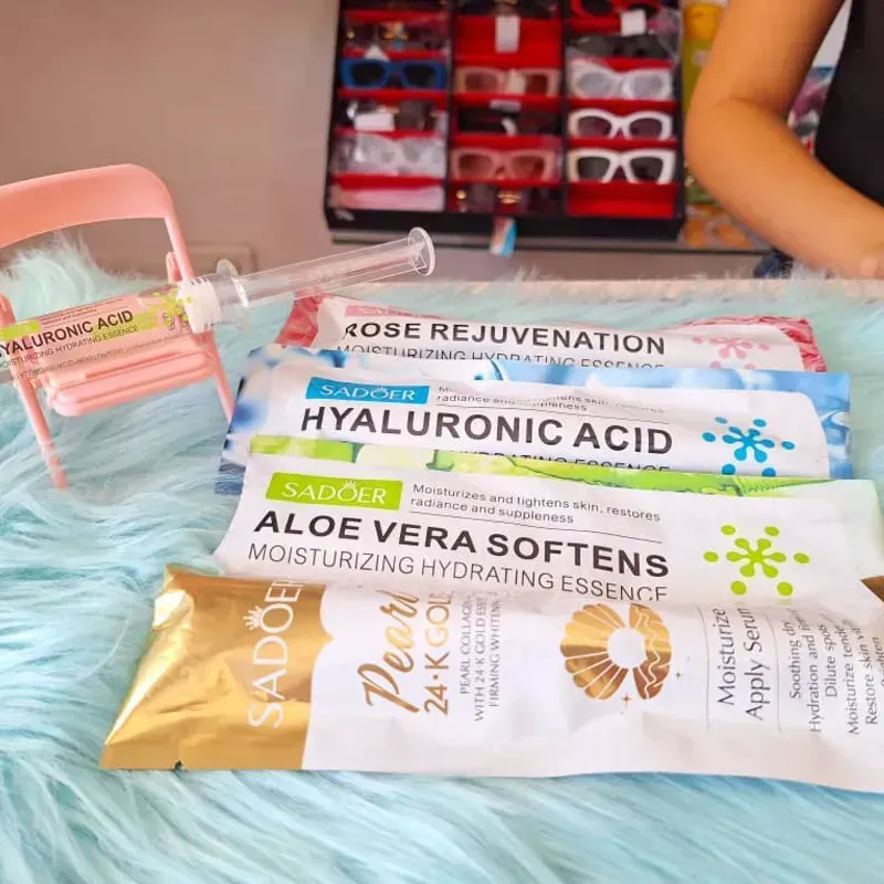 Sérums y esencias faciales: Se observan sobres de esencias hidratantes y rejuvenecedoras con ingredientes como Ácido Hialurónico, Rosa y Aloe Vera.