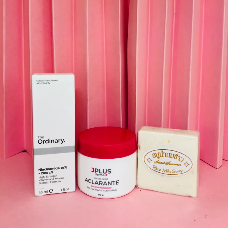 Contiene: -Serum de niacinamida The Ordinary: Reductor de imperfecciones y manchas -Crema aclarante: para una piel radiante y uniforme -Jabón blanqueador : Unifica el tono de la piel, hidrata y exfolia