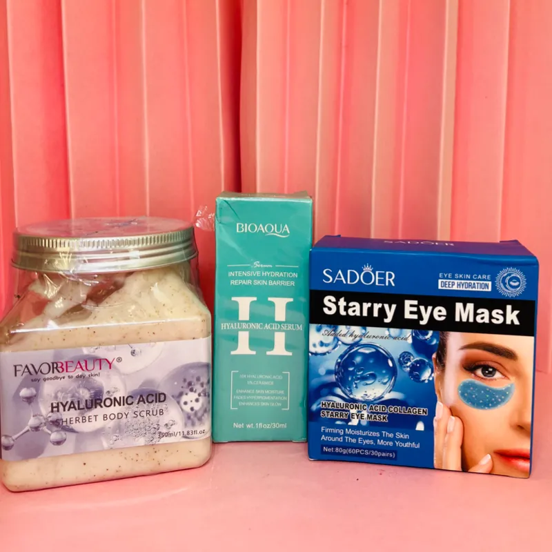 Contiene: -Exfoliante de ácido hialuronico 350ml: proporciona hidratación profunda, mejorando elasticidad, luminosidad y suavidad de la piel. -Serum de ácido hialuronico bioaqua 30ml: hidratación y reparación de la piel -Mascatillas para los ojos estrelladas 30pares: reafirmantes e hidratantes, mejorando la apariencia de ojeras y bolsas.