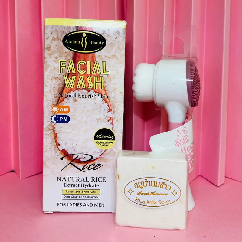 Contiene: -Limpiador facial de arroz: hidratante y reparador mejorando la estructura de la piel -Jabón de arroz: exfoliante, limpiador, ayuda a eliminar manchas y unificar el tono de la piel -Cepillo de limpieza: herramienta para limpiadores, exfoliantes y cremas