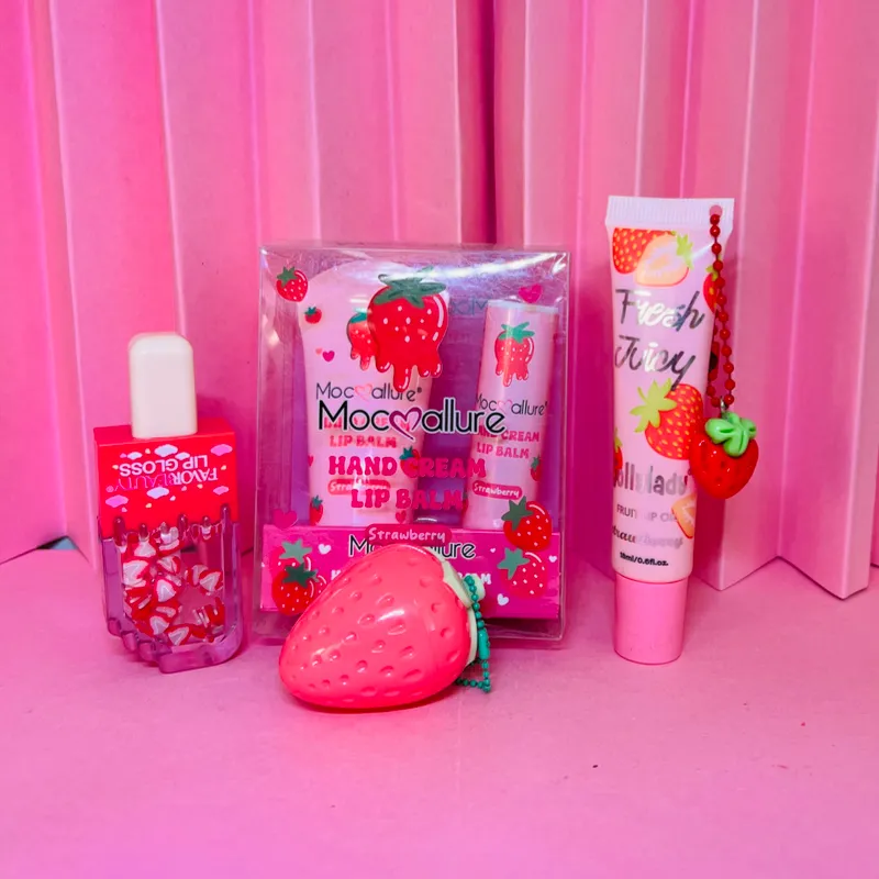 Contiene: -Brillo labial de fresa -Bálsamo labial de fresa -Brillo/colgante de fresa -Set de bálsamo y crema de fresa