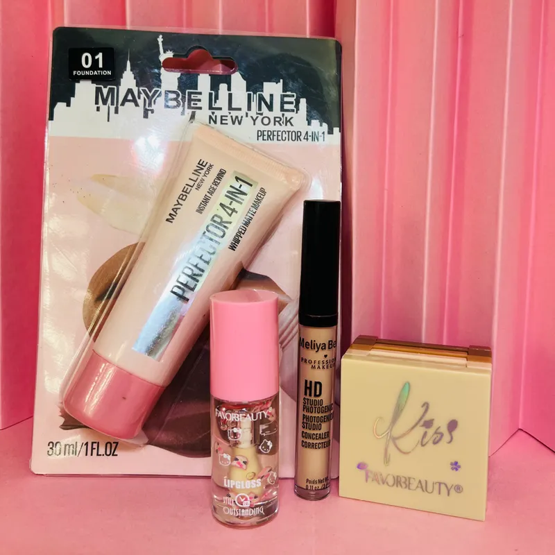 Contiene: -Base líquida Maybelline -Brillo labial Hello Kitty -Corrector líquido -Paleta Multifuncional 4en1