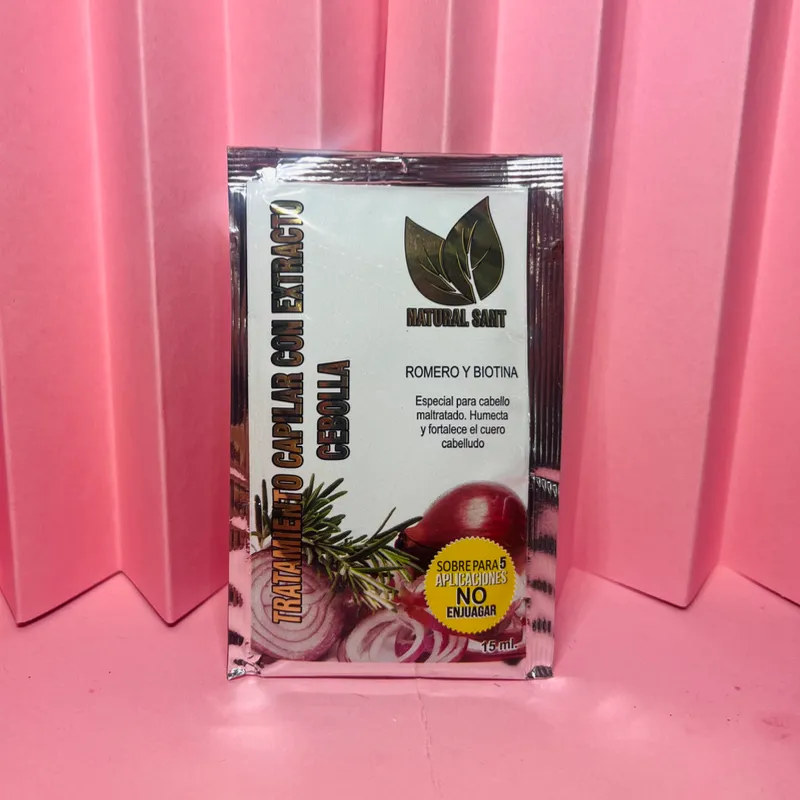 15ml BENEFICIOS: EL TRATAMIENTO CAPILAR CON EXTRACTO DE CEBOLLA, ROMERO Y BIOTINA Natural Sant hidrata, acondiciona y suaviza el cabello. Las propiedades naturales del extracto de cebolla lo hacen especial para el cabello maltratadl, ayudan a su fortalecimiento y crecimiento. El contenido de keratina facilita el manejo de cabellos esponjados y facilitan el peinado. MODO DE EMPLEO: Lave su cabello con shampoo, luego aplique una mínima cantidad de TRATAMIENTO CAPILAR CON EXTRACTO DE CEBOLLA, ROMERO Y BIOTINA de medios a puntas en forma de masaje, déjelo actuar y no enjuague.