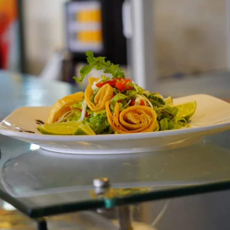 Vegetales, cebolla, costrones de pan y aceite de oliva. Vegetables, onion, bread croutons and olive oil.