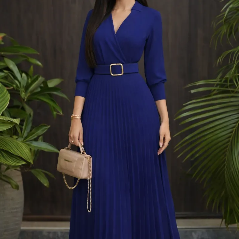 Vestido midi azul de corte plisado, diseñado para ofrecer una combinación perfecta de elegancia y comodidad. Presenta un escote cruzado en V que estiliza el busto y mangas 3/4 que aportan un toque sofisticado. Su cinturón a juego con hebilla dorada define la cintura y realza la silueta, mientras que la falda plisada brinda movimiento y fluidez al caminar. Confeccionado en tela ligera y fresca, es ideal para eventos formales, reuniones especiales o salidas donde quieras lucir femenina, elegante y segura.
