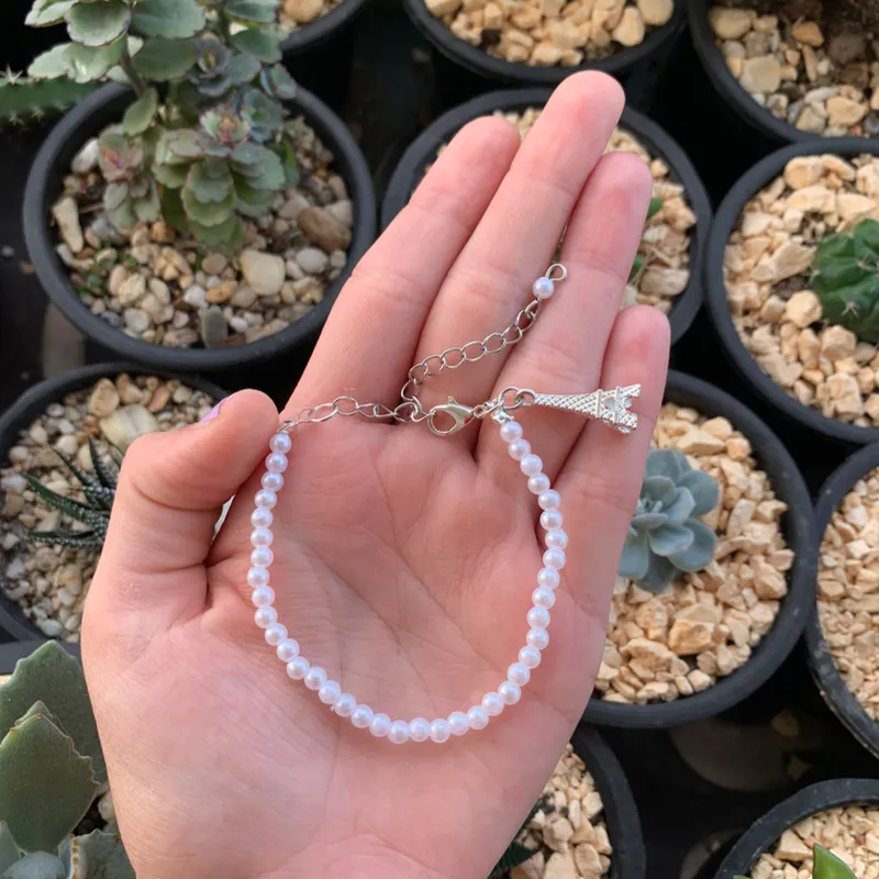 Tobillera con perlitas blancas coco y dije de Torre Eiffel en cierre