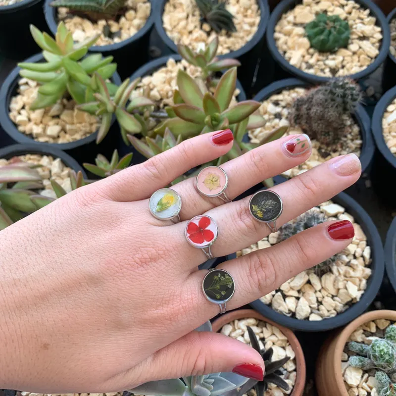 Anillos ajustables, con flores naturales encapsuladas en resina
