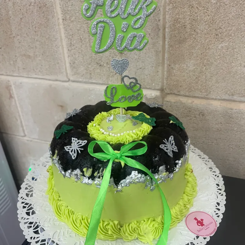 Masa esponjosa de chocolate o vainilla con una base de panetela de 22 cm , relleno de ganache y encima un roscón bañado en leche condensada , decoración comestible de chocolate y adornitos sencillos de Foami incluidos.