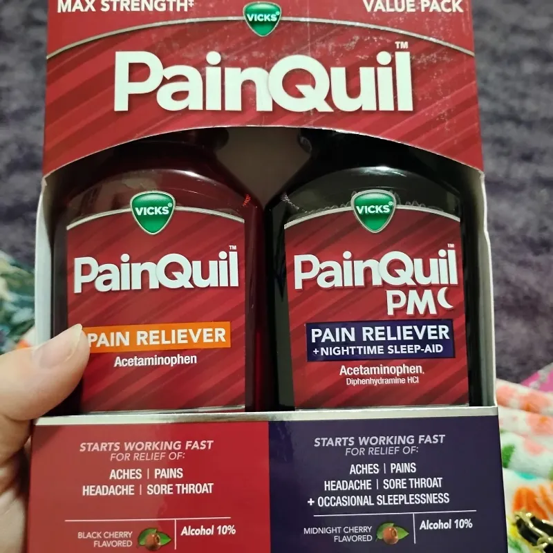 Incluye 2 botellas de 12 fl oz (354 ml) cada una, para un total de 24 fl oz (708 ml). Fórmula Diurna: Contiene 1000 mg de acetaminofén por dosis para aliviar dolores de cabeza, musculares y de garganta sin causar somnolencia. Fórmula Nocturna: Contiene 1000 mg de acetaminofén y 50 mg de difenhidramina HCl por dosis para aliviar el dolor y ayudar a conciliar el sueño.