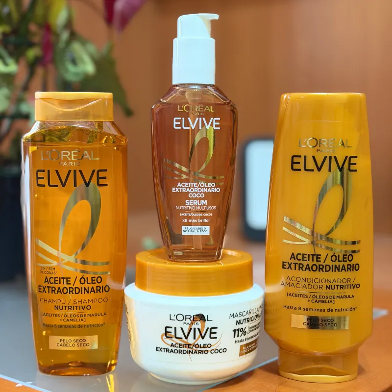 Elvive Aceite Extraordinario de L'Oréal Paris, diseñada específicamente para proporcionar una nutrición profunda al cabello seco. La gama utiliza una combinación de aceites, como los de marula y camelia, para transformar el cabello, aportándole brillo y suavidad sin dejar sensación grasa.