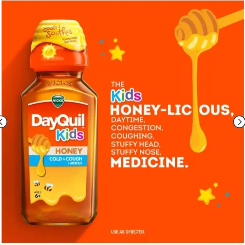 Vicks DayQuil Kids Honey Cold & Cough + Mucus: Un jarabe diurno para niños mayores de 6 años, formulado con miel real para aliviar la tos, la congestión nasal y torácica