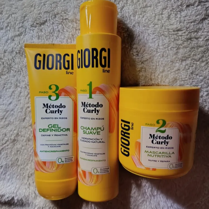 Método Curly de Giorgi Line, una rutina simplificada de tres pasos diseñada para cuidar e hidratar el cabello rizado. Todos los productos de esta línea son aptos para el método Curly Girl, ya que están formulados sin sulfatos, siliconas ni alcoholes secantes.