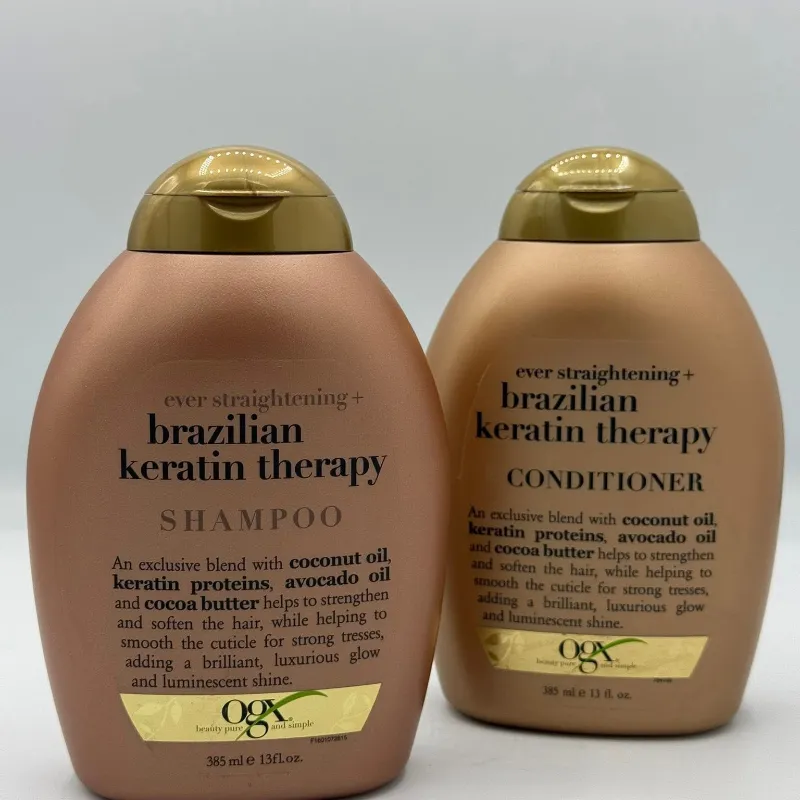 champú y el acondicionador OGX Ever Straightening + Brazilian Keratin Therapy, diseñados para fortalecer, suavizar y alisar la cutícula del cabello.