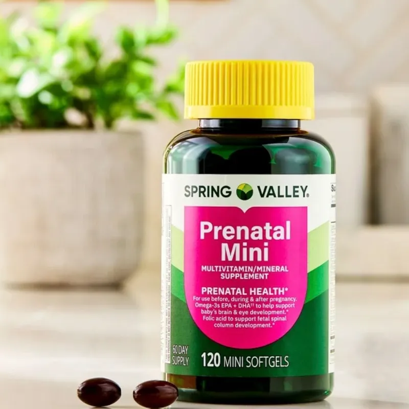 Spring Valley Prenatal Mini: Cápsulas blandas pequeñas que contienen 18 nutrientes esenciales, incluyendo hierro, ácido fólico y DHA/EPA para el desarrollo cerebral y ocular del feto.