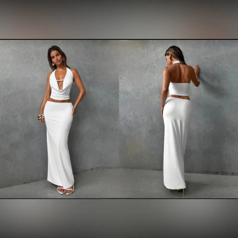 Conjunto blanco de saya larga y blusa babero