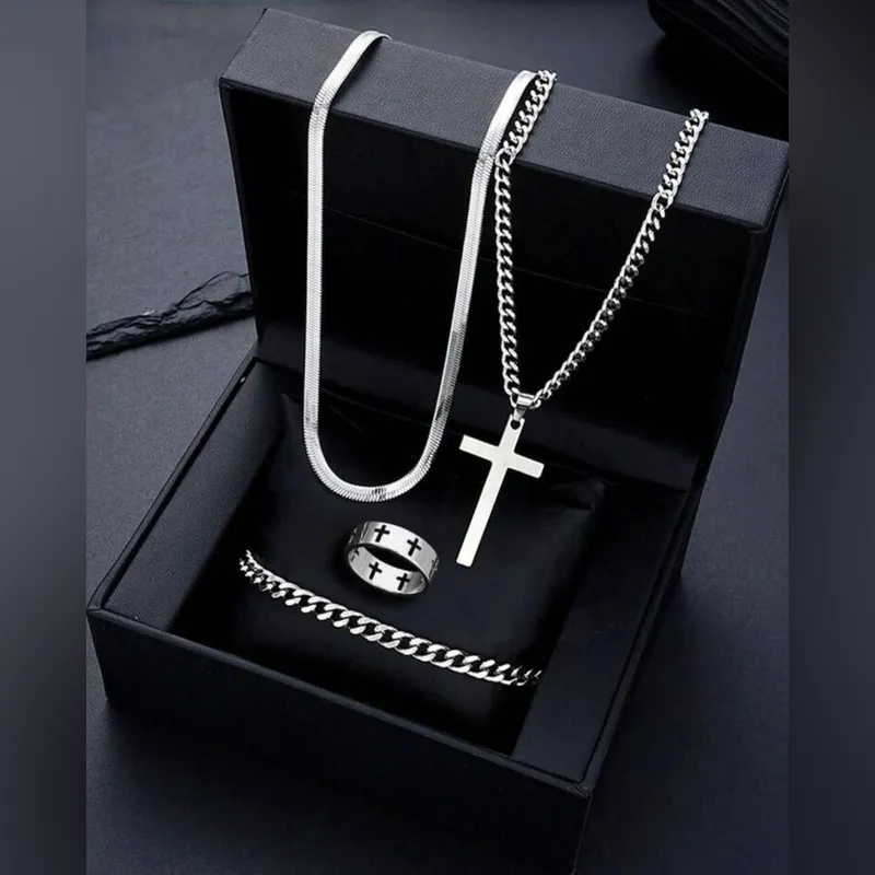 Conjunto plateado de cadena, pulsera y anillo