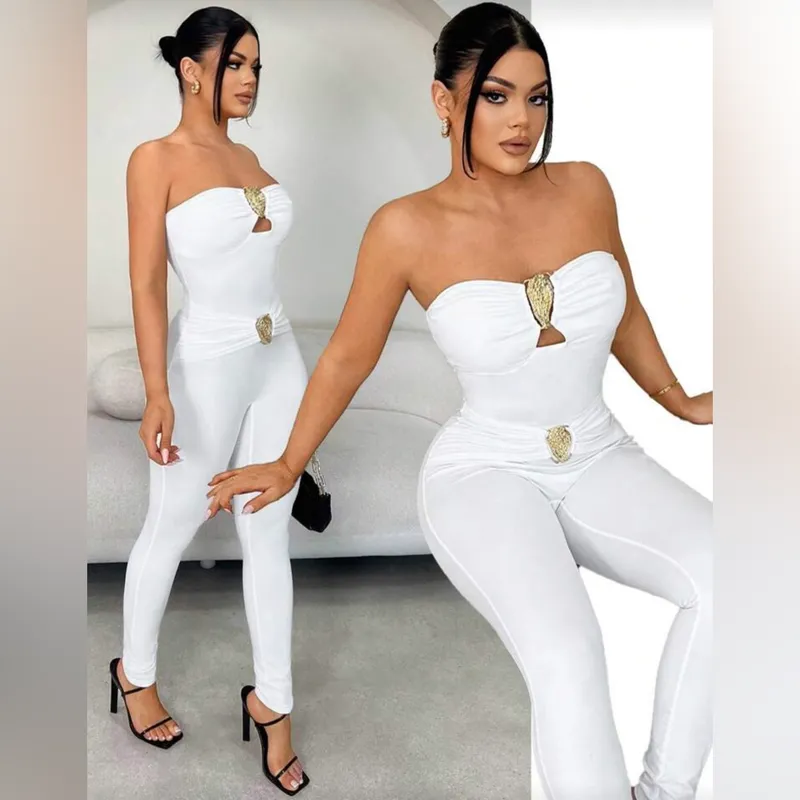 Enterizo largo blanco top con adornos dorados