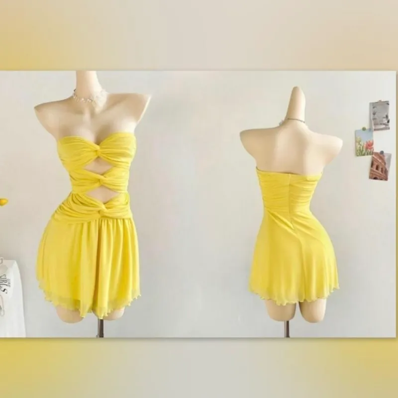 Vestido amarillo corto top con nudos delanteros