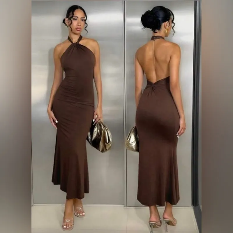 Vestido marrón con amarre en el cuello y escote en la espalda