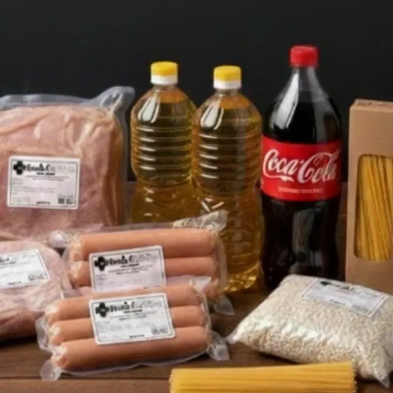 10 libras de pollo 2 paqte de salchicha 2 pomo de aceite 1 pomo de Refrescos 1.5l 1 paqte de Espaguetis 1 kg de arroz importado