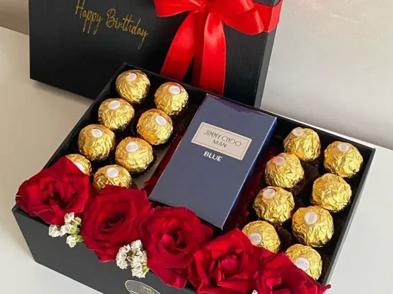 Contiene 4 rosas eternas Un perfume Una espuma de afeitar Una gorra Una cajita personalizada con 4 bombones