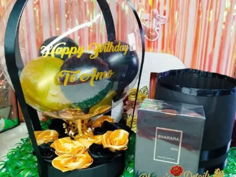 Caja de madera decorada Globos de números metálicos Perfume Nao Botella de whisky Happy Birthday