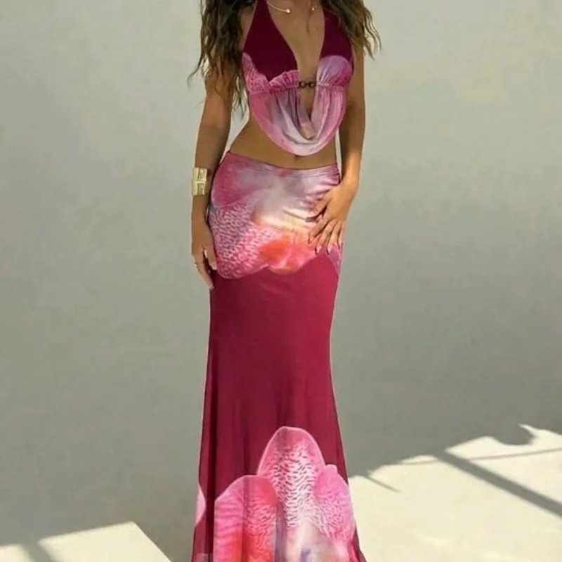 Conjunto floreado rosa y burdeos