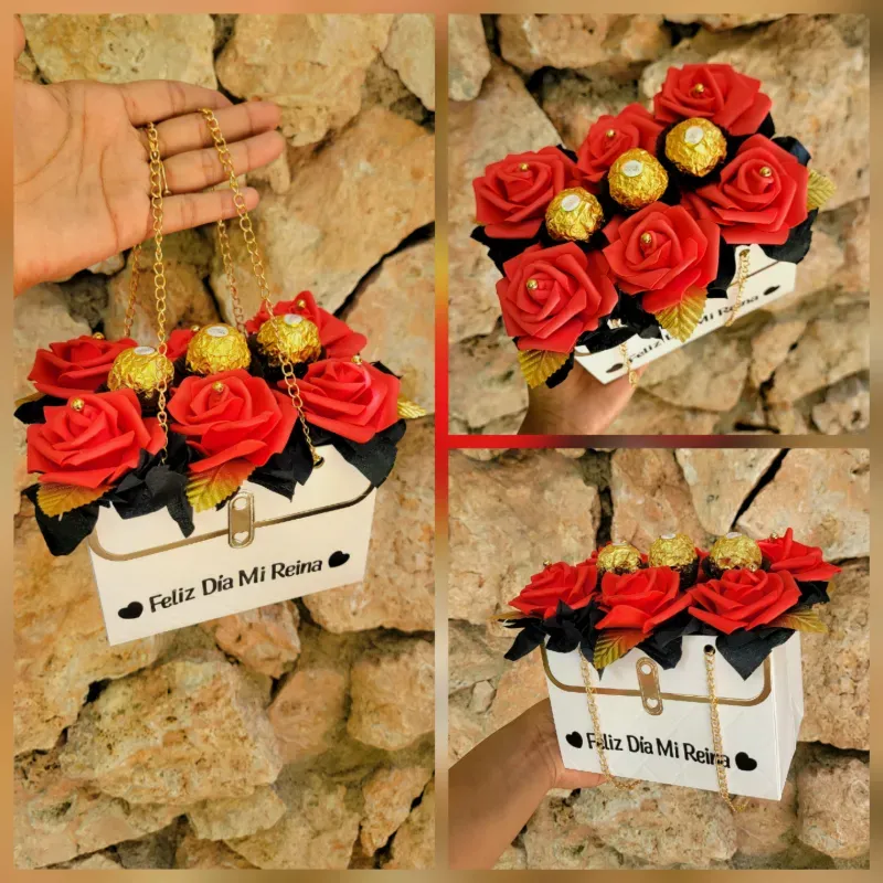 Incluye 6 rosas eternas de satén y 3 bombones de la colección Ferrero Rocher.