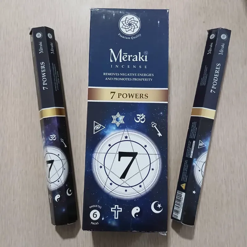 ALEJA LAS ENERGÍAS NEGATIVAS Y PROMUEVE LA PROSPERIDAD El incienso Meraki 7 Powers está diseñado para ayudar a fomentar el poder interior, eliminar energías negativas y promover la prosperidad. Se utiliza en prácticas espirituales, meditación y rituales para atraer equilibrio, protección y bendiciones. Propósitos y Beneficios Eliminación de Energía Negativa: Ayuda a limpiar el aura y los espacios, disipando las influencias nocivas. Atracción de Prosperidad: Se asocia con la atracción de la suerte, el éxito financiero y la abundancia. Fortaleza Espiritual: Se cree que evoca la fuerza espiritual y el poder de los siete santos o potencias africanas, que representan amor, dinero, felicidad, salud, protección, fuerza y éxito. Meditación y Relajación: El aroma complejo a flores y almizcle ayuda a crear un ambiente sereno para la meditación, el yoga o la reflexión tranquila. Manifestación de Intenciones: Encender este incienso puede ayudar a alinear las intenciones con la energía universal para manifestar deseos y metas.
