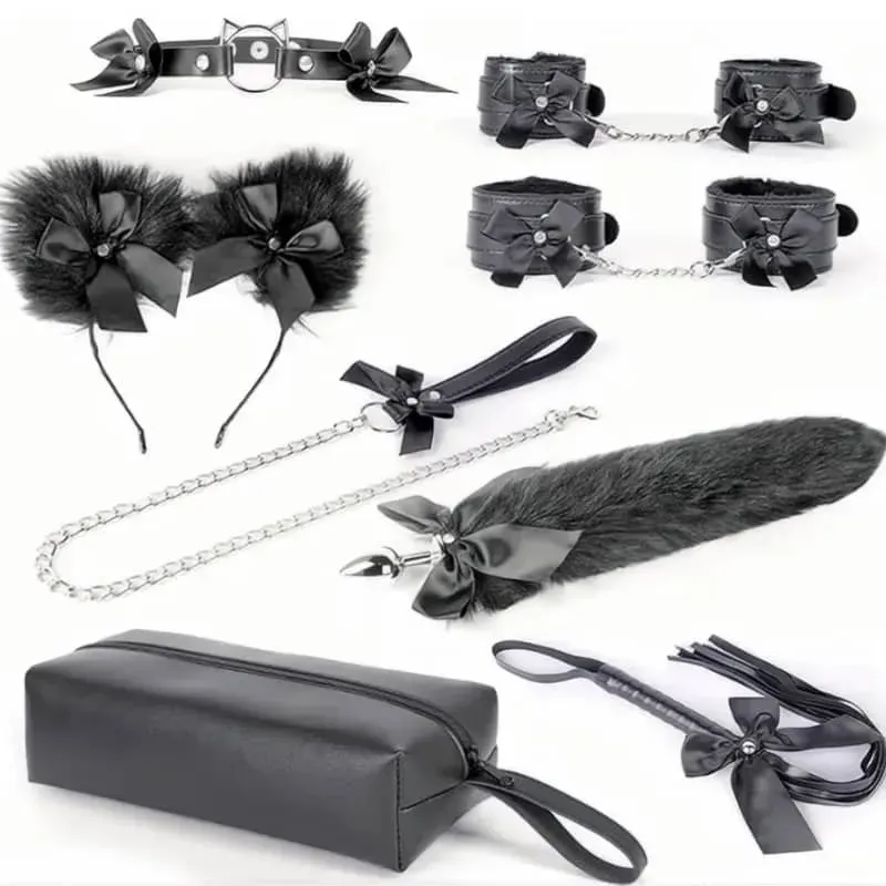 Incluye: Esposas de manos, Puños de piernas, Gargantilla, Cadena, Diadema de orejas, Flogger, Plug anal de cola y