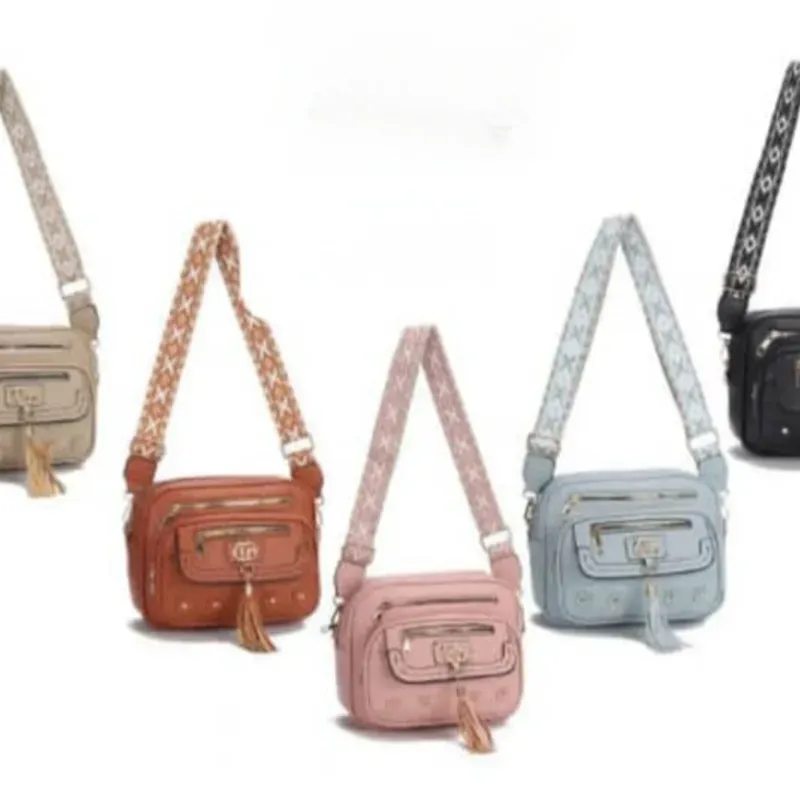Bolso tipo crossbody para mujer. Cartera diseñada para ofrecer funcionalidad y comodidad. Fabricado con materiales de alta calidad y textura suave al tacto. Cuenta con una correa textil ancha, ajustable y extraíble con diseño geométrico.