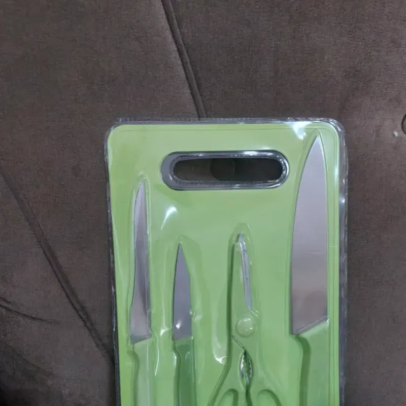Pack de cuchillos y tijera que incluye tabla de picar verduras. Gracias a su diseño ergonómico podrás cortar los alimentos cómodamente y sin dificultad.