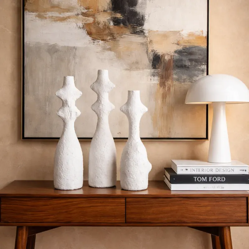 Búcaros decorativos completamente artesanal. Piezas escultóricas con gran presencia y carácter, ideal para aportar un toque artístico y elegante a cualquier ambiente. Alturas 60cm 55cm y 35cm 45usd los tres o 15usd por unidad