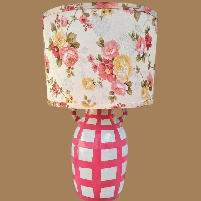 Lámpara de mesa con base de cerámica artesanal en blanco con cuadros en rosa, una combinación clásica que nunca falla. su pantalla, con un patrón en rosas a relieve, crea un juego visual perfecto con la base y le aporta personalidad, humor y encanto. Una pieza única, hecha con alma y detalle, que transforma cualquier espacio.