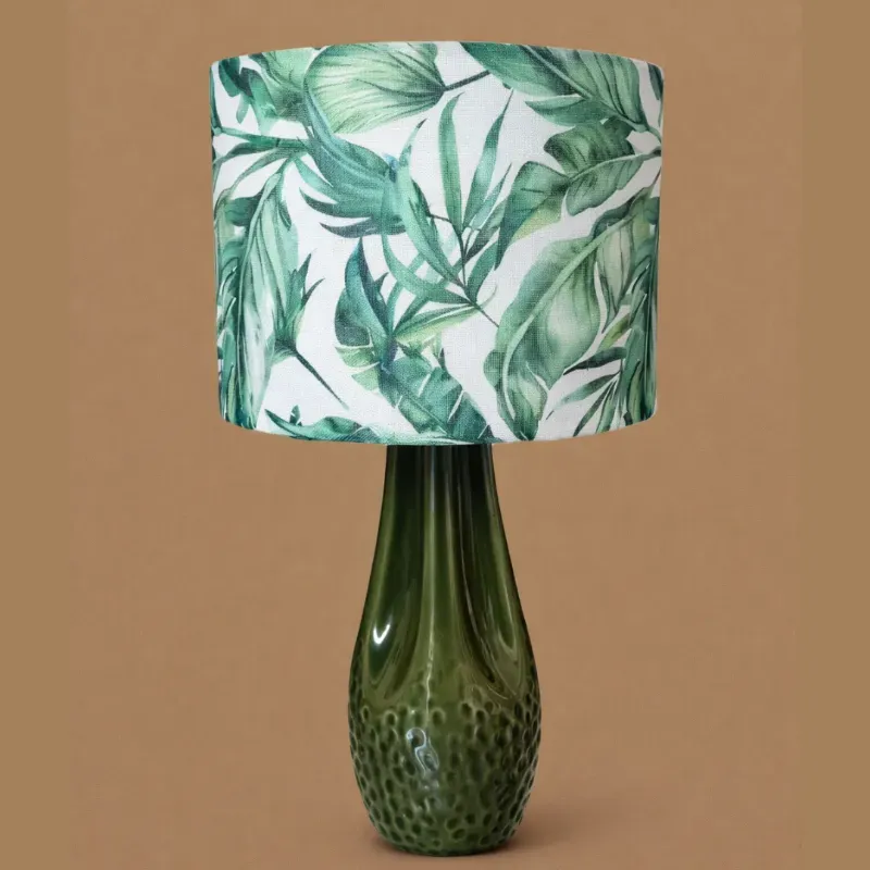 Base en cerámica verde y pantalla en tela de lino con patrones de hojas tropicales.