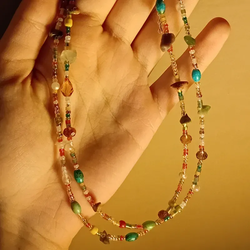 Puedes escoger el color o los colores que desees. Tiene cuentas de madera, cristal, cuarzo y otros tamaños para hacerla variada
