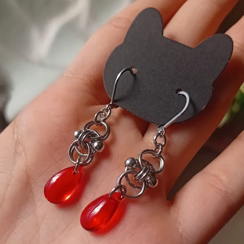 Aretes de acero inoxidable y cuentas rojas de acrílico que imitan gotas de sangre. Se pueden llevar bien incluso si tienes expansiones ❣️