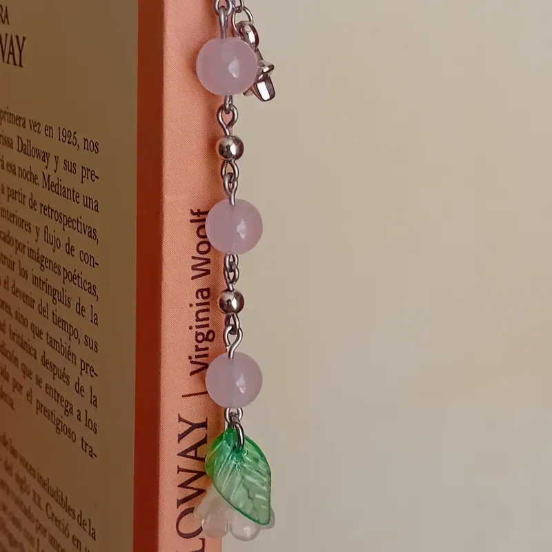 Este modelo usa cuentas de cristal y el alambre y cadena son de acero inoxidable. Dentro tiene una hojita plana para sostenerlo y que no se escape. Hay distintos colores de campanilla a escoger, sólo comunícate conmigo 🌷