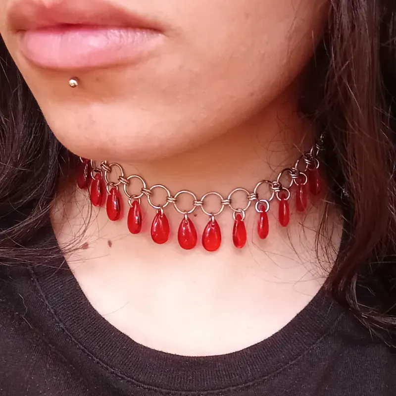 Imitando la sangre que cae de la mordida de un vampiro, este collar posee una linda asimetría que te hará destacar por encima de todos