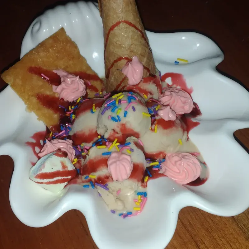 DULCE Y ENCANTADOR POSTRE CON 3 BOLAS DE HELADO ACOMPAÑADAS DE UNA BARQUILLA Y DE UNA MARQUESITA ,UNA VACE DE LECHE CONDENSADA, PERFECTO PARA DISFRUTAR DEL PLACER DEL INVIERNO EN UN BOCADO.
