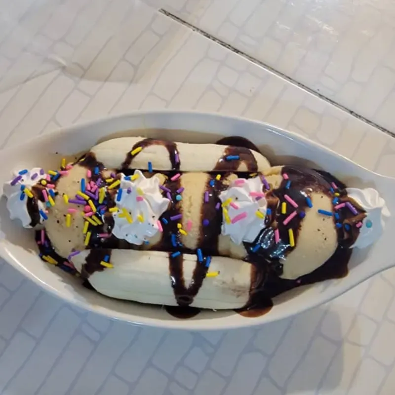 POSTRE PREPARADO CON BANANA FRESCA,TRES BOLAS DE HELADO Y DELICIOSOS TOPPINGS