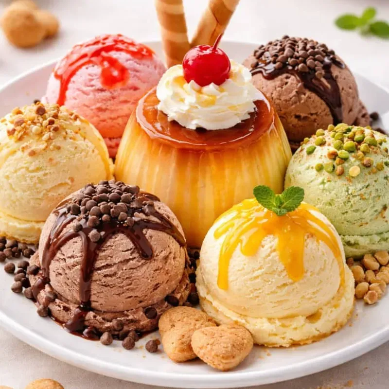 EXQUISITA COMBINACIÓN DE 6 BOLAS DE HELADOS ACOMPAÑADAS DE FLAN SUAVE Y GALLETAS CRUJIENTE ,POSTRE ABUNDANTE Y PERFECTO PARA LOS AMANTES DEL DULCE.
