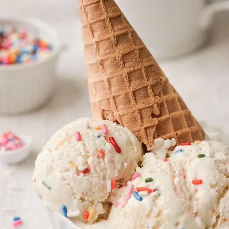 DULCE Y ENCANTADOR POSTRE CON 3 BOLAS DE HELADO ACOMPAÑADAS DE UNA BARQUILLA CRUJIENTE, PERFECTO PARA DISFRUTAR DEL PLACER DEL INVIERNO EN UN BOCADO