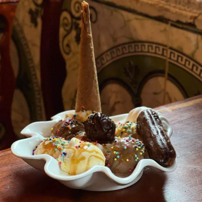 EXUBERANTE POSTRE CON 6 BOLAS DE HELADO ,MARQUESITA ,BOMBÓN ,BARQUILLA Y UN TOQUE DE LECHE CONDENSADA ,UNA EXPERIENCIA DULCE LLENA DE SABOR Y TEXTURA .