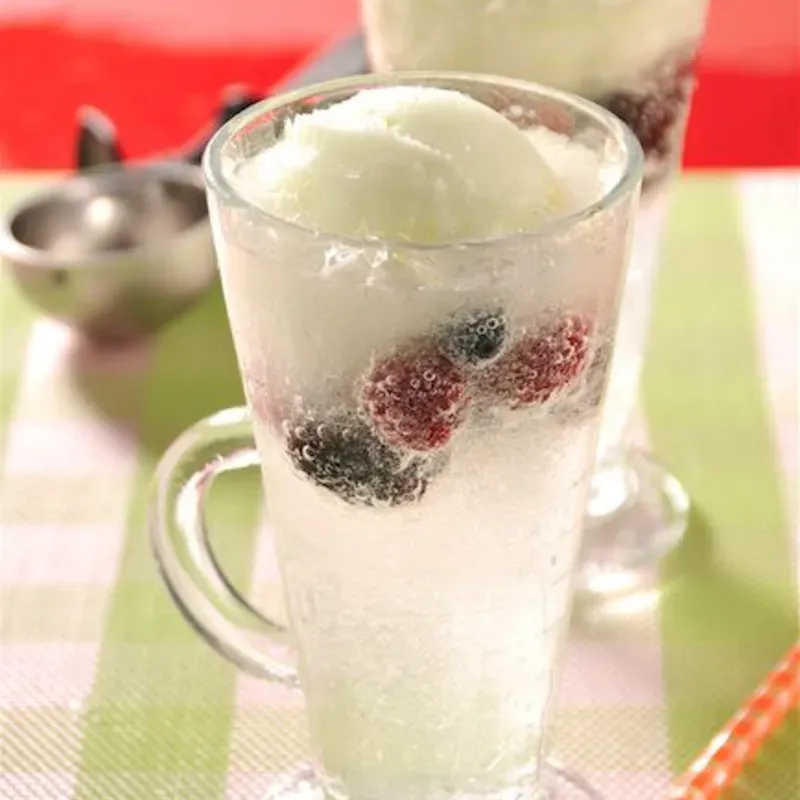 REFRESCANTE POSTRE CON HELADO CREMOSO SERVIDO CON REFRESCO DE LIMON Y DECORACIONES DULCES.